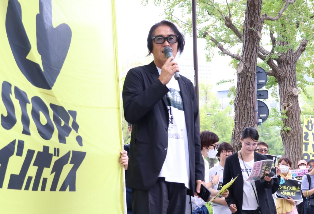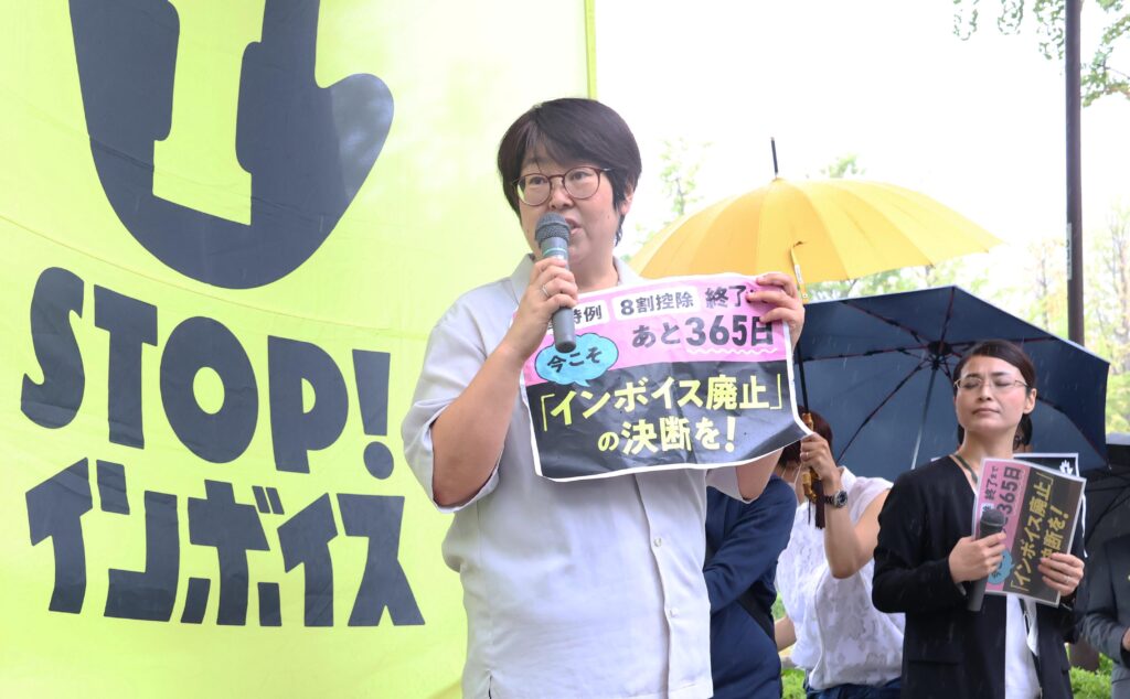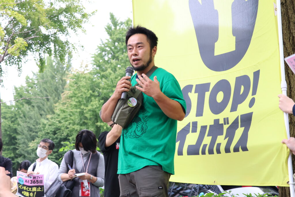 インボイス導入から2年、特例措置の廃止まであと1年の節目を迎え、「STOP!インボイス10.1デモ」が10月1日、衆議院第二議員会館前で開かれました。雨が降る中、野党の国会議員10人を含む約80人が参加。「今こそ決断、インボイス廃止」のコールを繰り返しました。