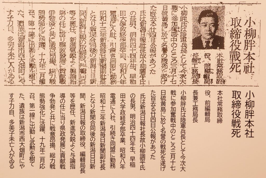 新潟県を拠点とする地方紙、新潟日報社で第4代社長を務め、太平洋戦争末期に米軍の捕虜となった小柳胖(おやなぎ・ゆたか 1911-1986)。その数奇な人生をたどる企画展が、新潟市中央区の「にいがた文化の記憶館」で開催されている(2025年11月3日まで)。タイトルは「戦後80年 捕虜になった記者 小柳胖」。小柳が兵士として送られた硫黄島から家族に宛てた書簡や、ハワイの捕虜収容所で記したジャーナリズム論など約80点が展示されている。同展を基に「新聞人小柳の戦争」を、時代背景とともにたどってみたい(書簡などの原文は旧漢字、歴史的仮名遣いだが、読みやすいようにした)。