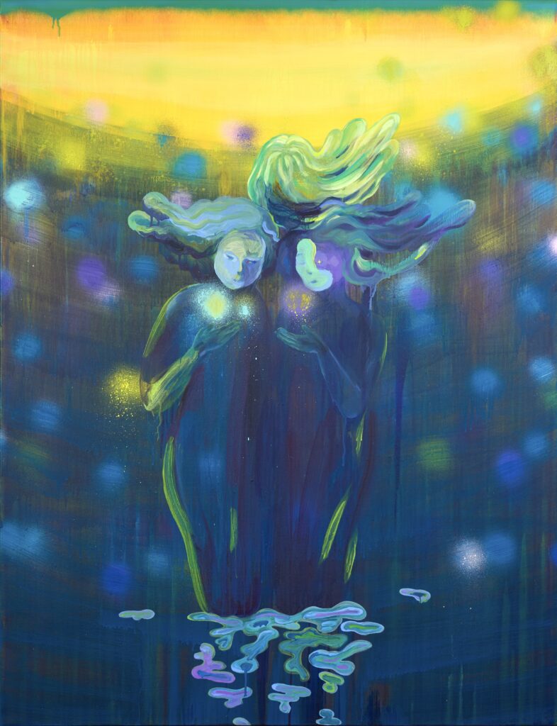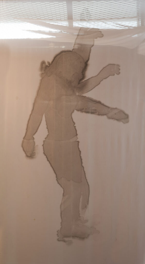 透けて見える布に墨とアクリルで、女性たちの身振りを描きました。