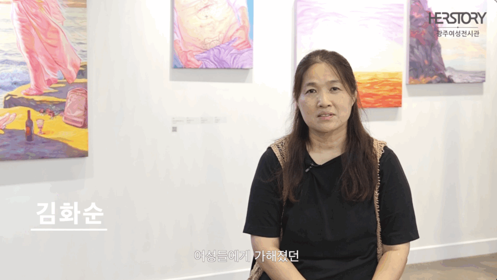 | キム・ファスン(アーティスト) 韓国の近現代史に起きたいたましい性暴力の話、日本軍性奴隷の被害者、済州島4・3事件の中の性暴力はまだ記録さえされていません。そして5・18光州事件での性暴力など、描く作業は大変でしたが、光州で声を上げた女性たちの美しい勇気に連帯する心で制作しました。 |