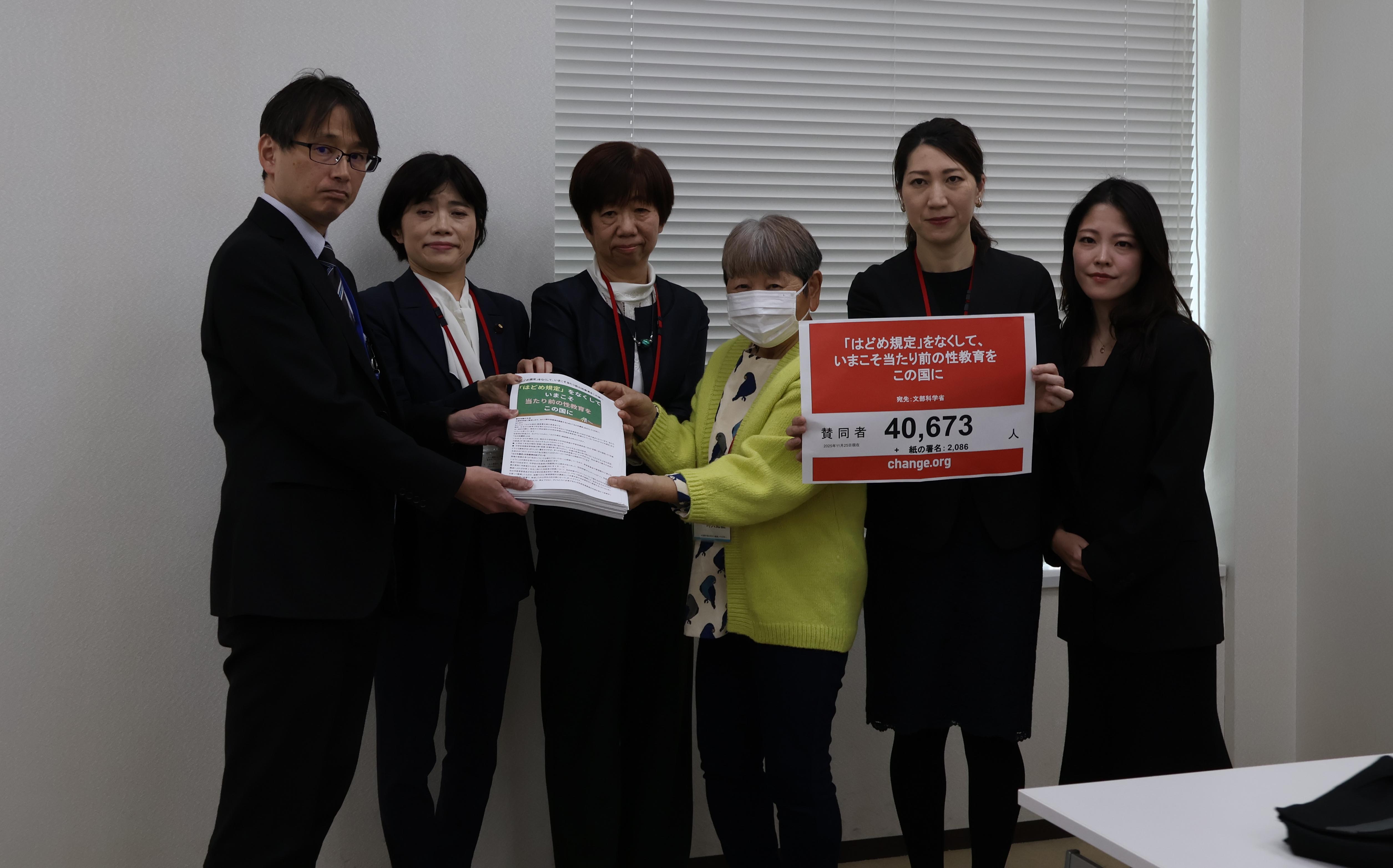 中央教育審議会で学習指導要領の約10年に一度の見直しが進められています。指導要領にある性教育の内容を制限する「はどめ規定」の削除と包括的性教育の実施を求めて、性教育に携わる市民団体などが11月27日、文部科学省に42,759筆の署名を提出し、申し入れを行いました。保健体育の学習内容を所管するスポーツ庁は「性教育は子どもの発達段階に沿って、個別に対応する」との見解を繰り返し、議論はかみ合いませんでした。