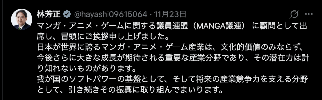 「日本が世界に誇るマンガ、アニメ、ゲーム産業は大きな成果が期待される重要な産業分野であり、潜在力ははかりしれない。我が国の将来の産業競争力を支える分野として、引き続きその振興に取り組んで参ります」と。めちゃくちゃこの業界に期待されていました。
