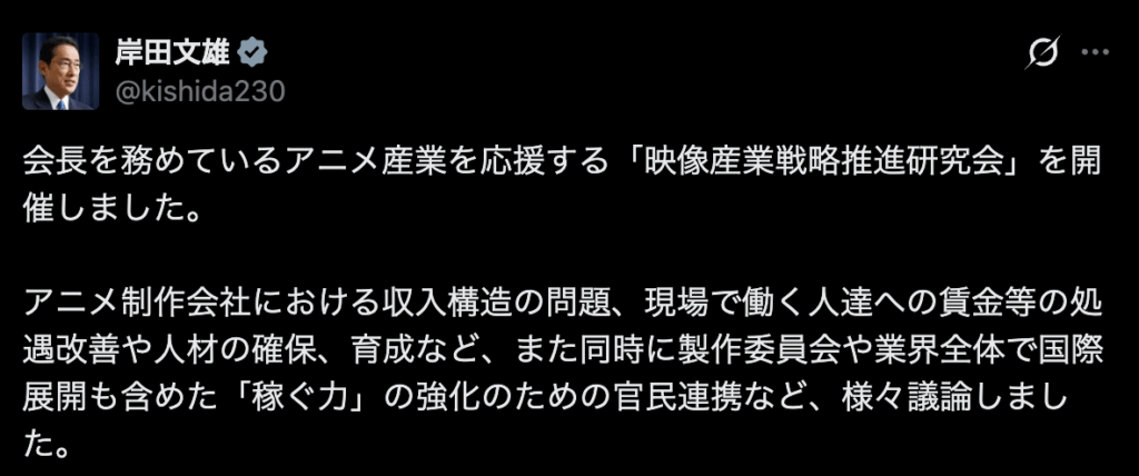 11月28日、岸田元総理も映像産業戦略推進研究会の中で「アニメの、世界で稼ぐ力の強化のために官民連携しよう」的なことを投稿されました。世界で、この業界でもうける気満々です。林、岸田両氏の投稿にびっくりするほどたくさんのコメントが付きました。