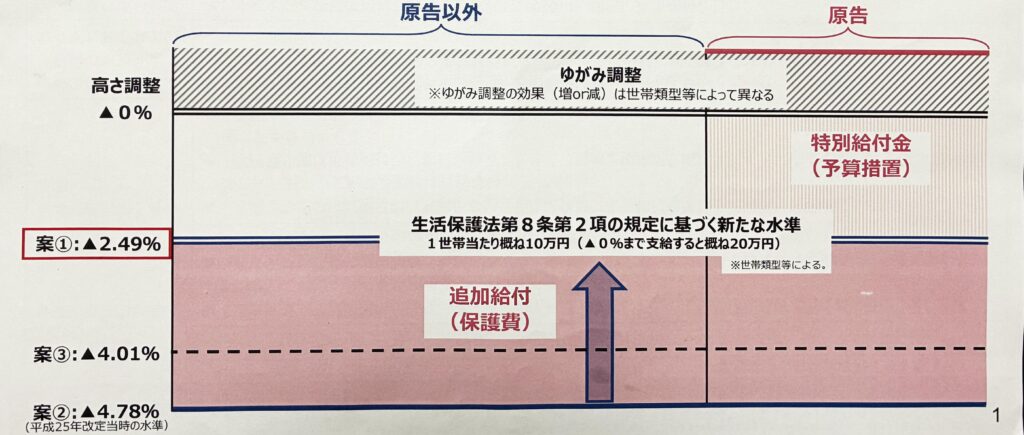 - 最高裁で違法とされた「デフレ調整」(-4.78%)に代わり、低所得者(下位10%)の消費実態との比較による新たな「高さ調整」を-2.49%とし、実施。