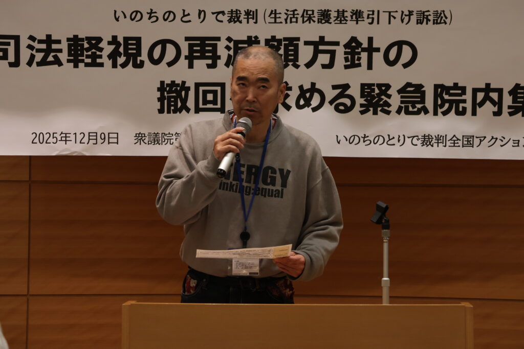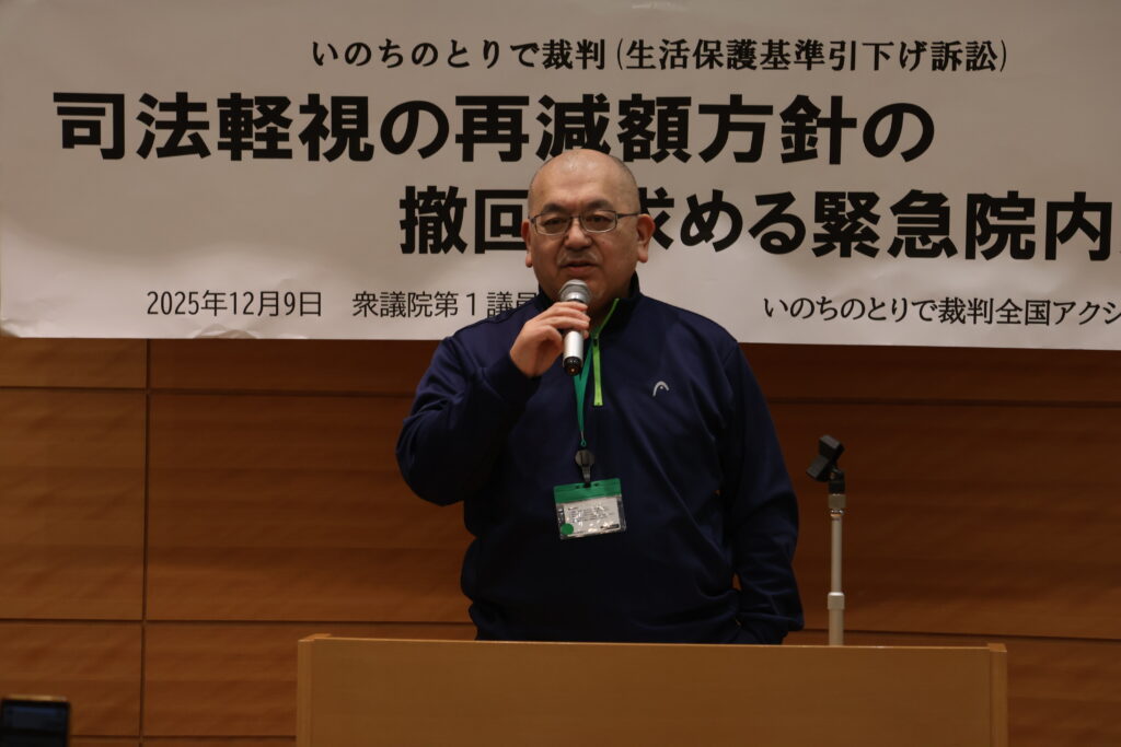 最高裁判決以降、私たちの要請に何一つ応えることない厚労省には、改めて怒りしかありません。私たちは生活と健康を守る会で原告以外の利用者と話をした時に、これはおかしいんじゃないかと、同じ被害を受けているのになぜ差がつくんだと、そういう話を聴きました。全額補償っていくらなんだと。2013年から再改定の5年間なのか、今日まで続いているのか、そこを知りたいという声がありました。私は「もう少し待ってくれ」という話しかできませんでした。