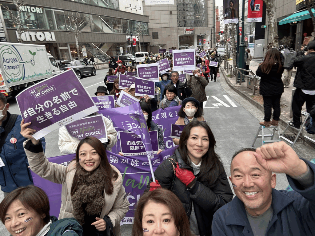 選択的夫婦別姓の実現をもとめてデモ行進する人たち(「あすには」提供)