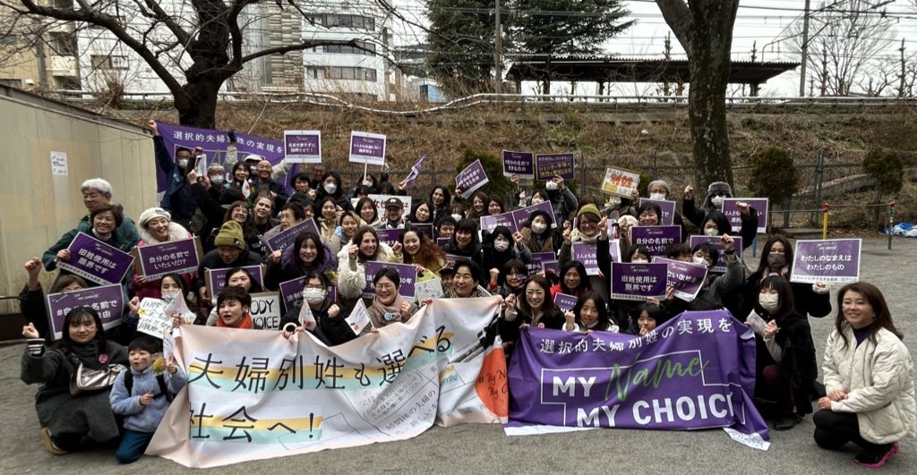 MY NAME MY CHOICEの紫色のフラッグやバナーを掲げて運動を前進させてきた(「あすには」提供)