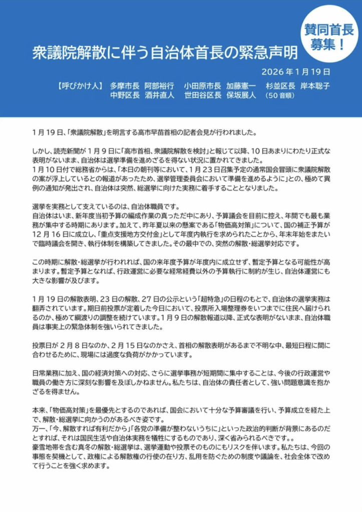 1月19日には、東京、神奈川の5首長から「衆議院解散に伴う自治体首長の緊急声明」が出された。ローカル・イニシアチブ・ネットワークのホームページから見ることができる。https://drive.google.com/file/d/1yYQa_Eelki5t-6-V4A6tUJ89p6vTJ6E5/view