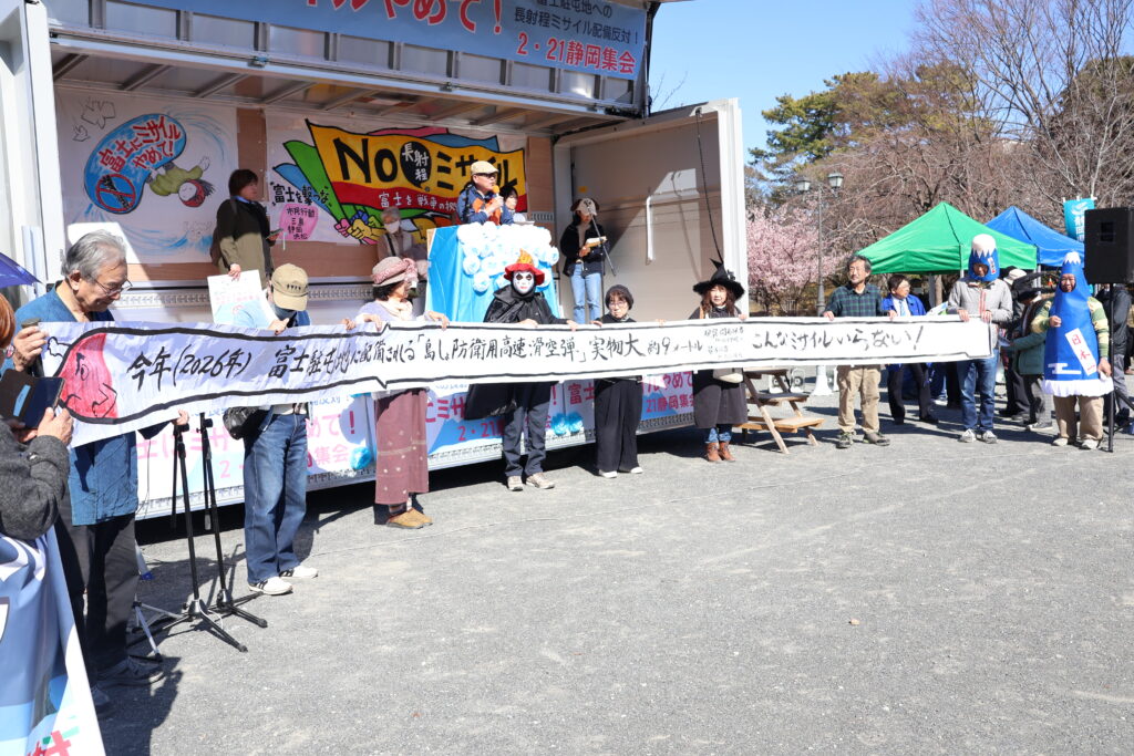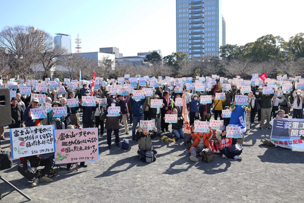 長射程ミサイルの東富士演習場への配備の期限が3月末に迫る中、反対の世論を盛り上げようと、市民団体「富士にミサイルやめて!の会」が21日、静岡市葵区の駿府城公園で集会を開きました。県内各地から450人が集まり、晴天の下、「富士から撃つな、ミサイル要らない」のコールを響かせました。