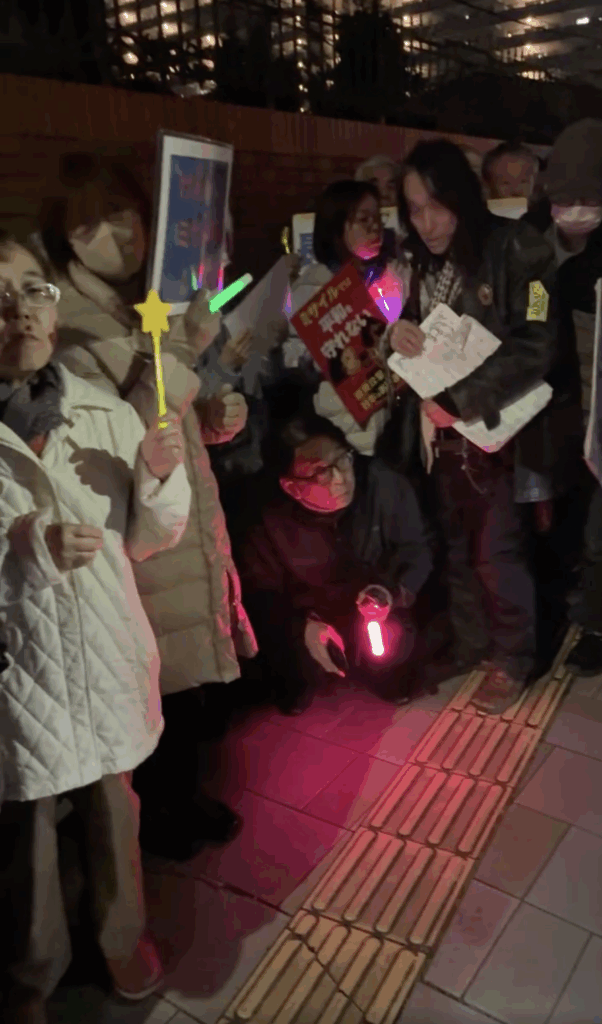 8日朝、飛行機で福岡へ。福岡の警固公園で開かれた国際女性デーのデモで、「本日21時30分から健軍駐屯地の正門前で集会をします」とスピーチしました。その甲斐あってか福岡や長崎、佐賀、そして地元・熊本から市民ら150人が集まりました。私は21時45分ぐらいに正門前に着きました。抗議行動をする市民らはペンライトを持ち、寒いのでカイロや飲み物が配られていました。正門に向かって右側に私たち、左側にミサイルに賛成している人や右翼30〜40人がそれぞれ結集し、騒然としていました。