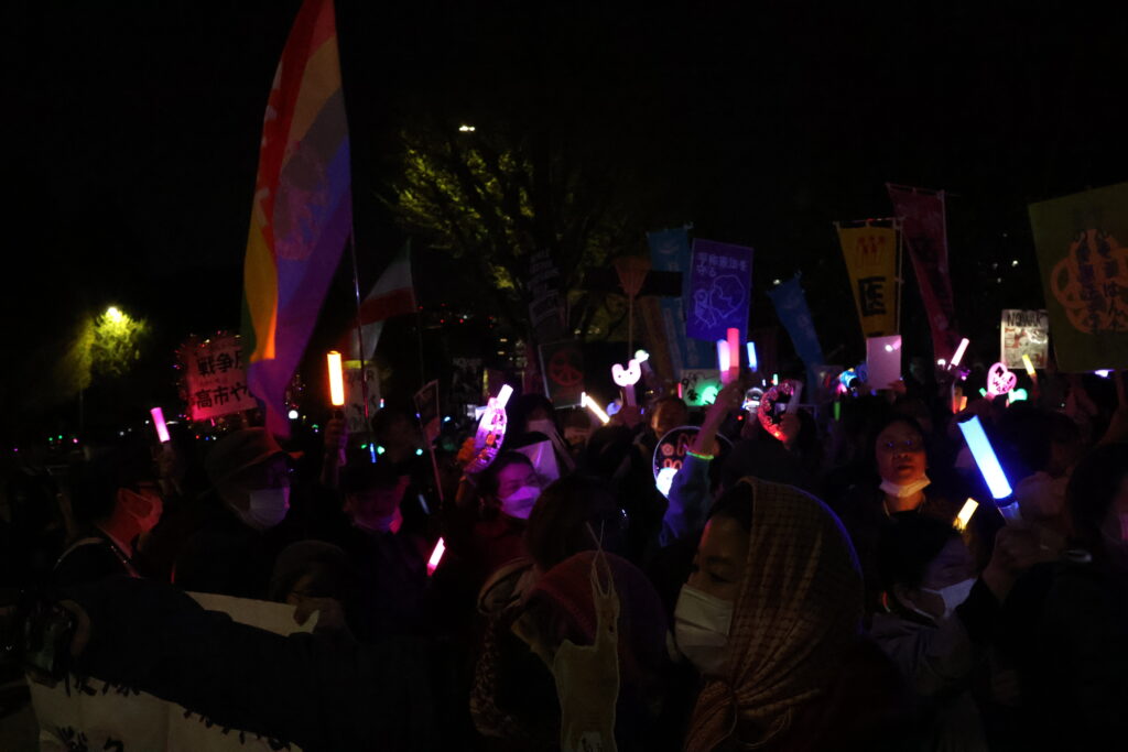 国会前に連なるカラフルな光の列。ペンライトを振って叫ぶ「改憲反対」の熱気を感じた。