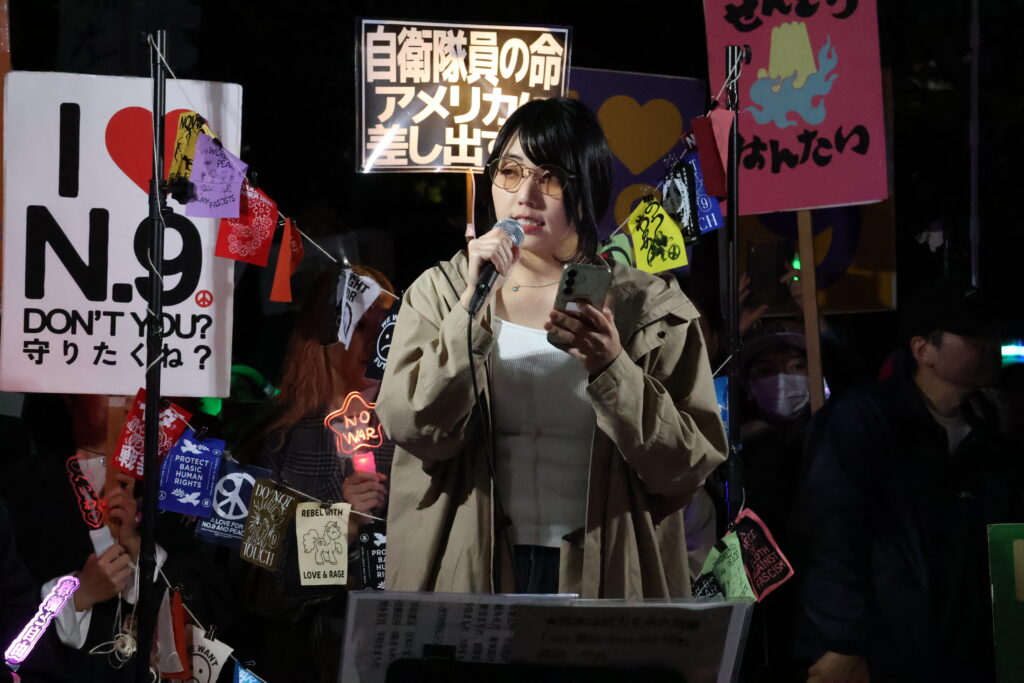 みなさんの今日の闘いは日本だけじゃなく、東アジア、韓国の、私の命の闘いでもあります。日本の平和憲法はアジア2000万の犠牲の上に立っている。忘れないでください。そこから外された在日朝鮮人、台湾の人々がいたことを。今「日本人ファースト」と言っている時代遅れの人々を国会から追い出しましょう。日本による戦争被害者は言っています。「戦争は絶対にダメだ」。明日、96歳のハルモニを連れて、軍需産業の三菱(重工業)に行きます。我々は勝ちます。