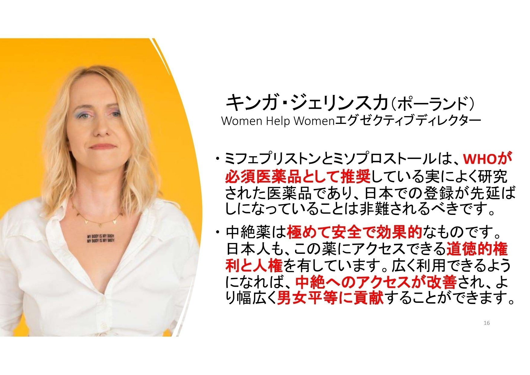 安全な中絶を受けられない国の女性たちに中絶薬を届ける活動をしている国際ボランティア団体「Women Help Women」のエグゼクティブプロデューサー、キンガ・ジェリンスカさん(ポ-ランド)は「ミフェプリストンとミソプロストールはWHOが必須医薬品として推奨している。日本人もこの薬にアクセスできる道徳的権利と人権を有しています。広く利用できるようになれば、中絶へのアクセスが改善され、より幅広く男女平等に貢献することができる」と語った。
